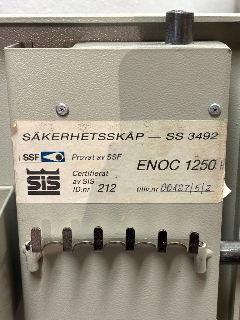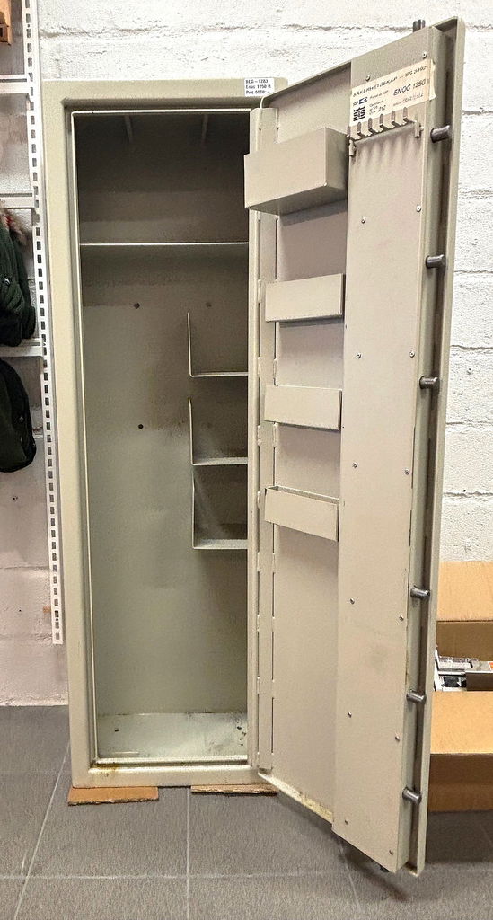 Vapenskåpet Enoc 1250 R med klassningen SS 3492 är ett godkänt säkerhetsskåp för vapenförvaring i Sverige.