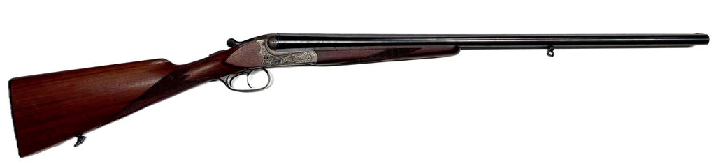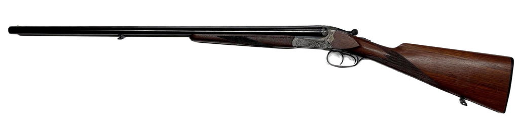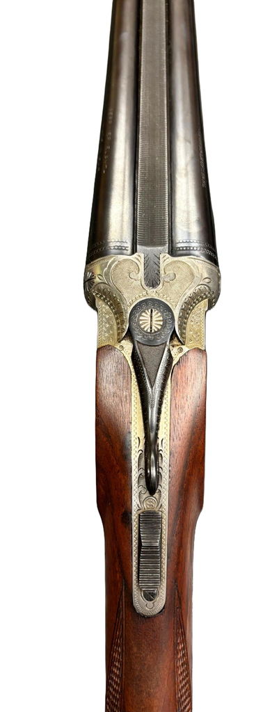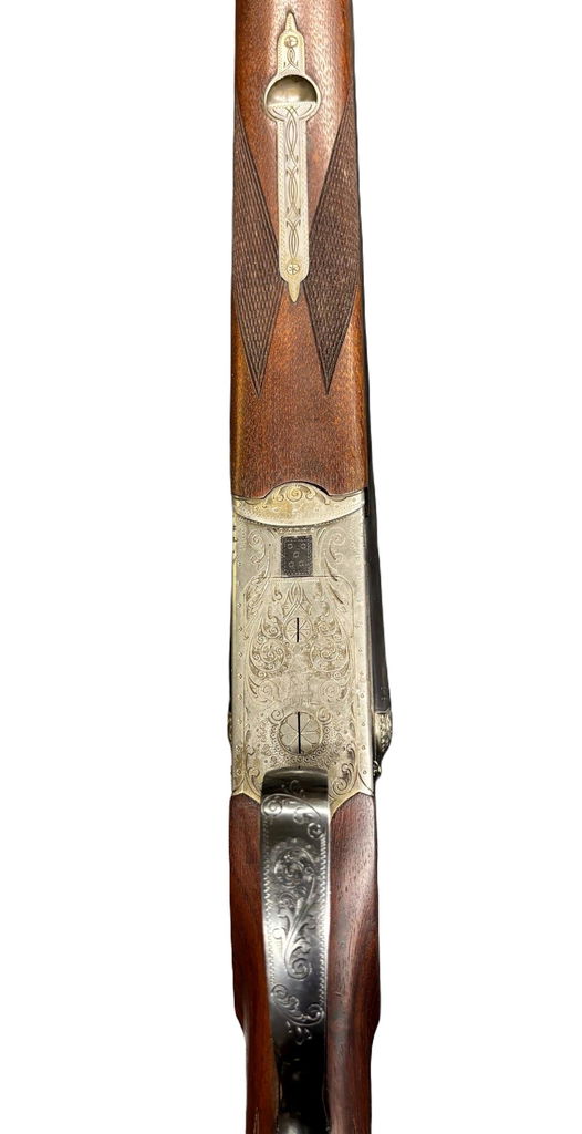 Den här modellen representerar det bästa från Merkels traditionella produktion: boxlock-lås med dubbla ejektorer, djup handgravyr, och valnötskolv med klassisk tysk formgivning.