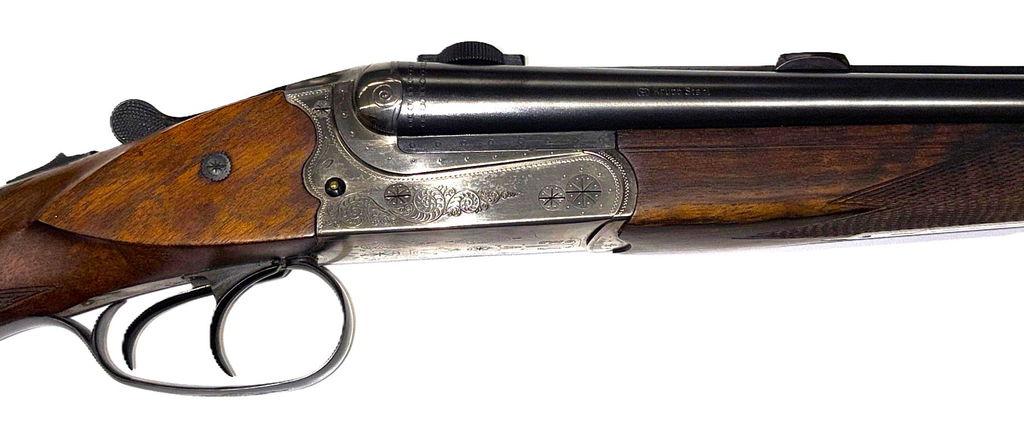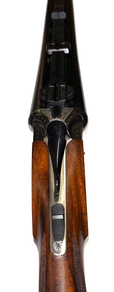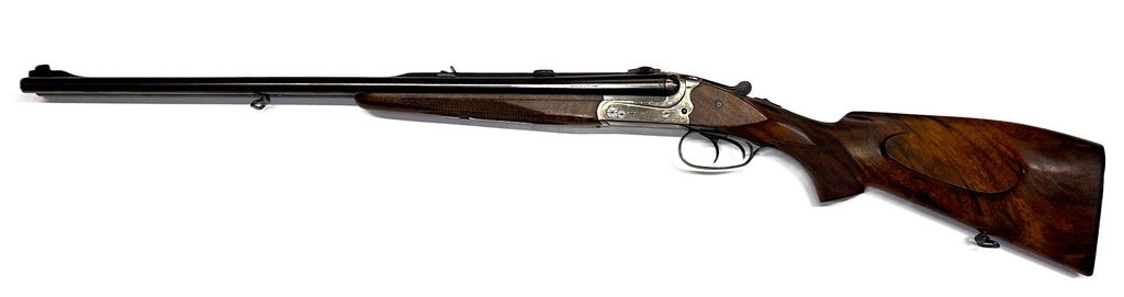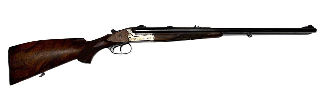Ett exklusivt och välbalanserat Merkel dubbelstudsare sida-vid-sida i klassisk storviltskaliber .375 H&H Magnum. Vapnet är i nyskick, med perfekt mekanik, fin blånering och valnötsstock i hög klass.