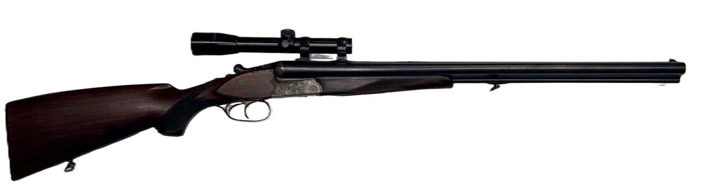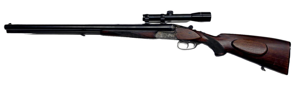 - Typ: Drillling (tre pipor) — två överliggande hagelpipor + en gevärspipa under